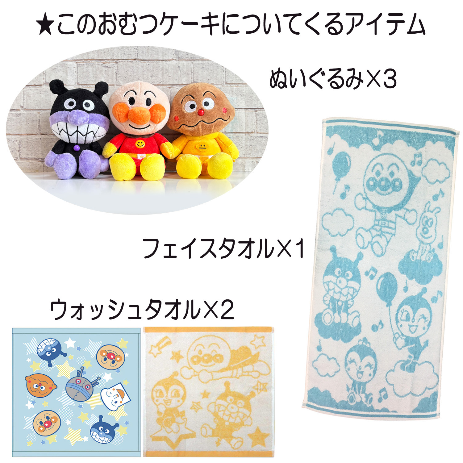 ●アンパンマン ウォッシュタオル×2 素材:綿100% ●アンパンマン フェイスタオル×1 素材:綿100% |