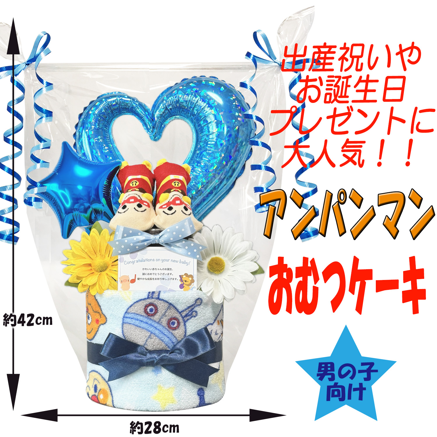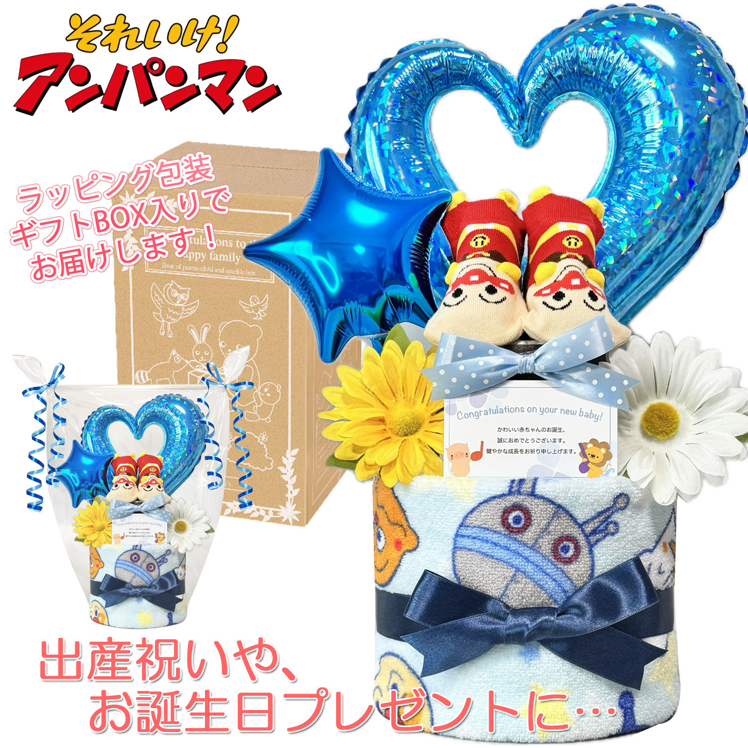 ママの目線でもらって嬉しいおむつケーキは、アンパンマンのベビーソックスとウォッシュタオルをセットに、可愛く1つ1つ丁寧に手作りされたボリューム満点で豪華な男の子用の2段おむつケーキのギフトです♪土台に使用されているおむつは産婦人科使用率No.1のパンパースを衛生面に気を付けて1枚1枚袋入りになったおむつケーキになっております。全てのおむつケーキはギフト用にラッピングを施し、可愛いギフトボックスにお入れしてお送りいたします。おむつケーキは出産祝いはもちろん、ハーフバースデー、1歳のお誕生日、ベビーシャワー、初節句、100日祝いなど、様々な場面で活躍する大人気のお祝いギフトです。