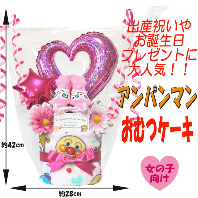 ママの目線でもらって嬉しいおむつケーキは、アンパンマンのドキンちゃんのベビーソックスとウォッシュタオルをセットに、可愛く1つ1つ丁寧に手作りされたボリューム満点で豪華な女の子用の2段おむつケーキのギフトです♪土台に使用されているおむつは産婦人科使用率No.1のパンパースを衛生面に気を付けて1枚1枚袋入りになったおむつケーキになっております。全てのおむつケーキはギフト用にラッピングを施し、可愛いギフトボックスにお入れしてお送りいたします。おむつケーキは出産祝いはもちろん、ハーフバースデー、1歳のお誕生日、ベビーシャワー、初節句、100日祝いなど、様々な場面で活躍する大人気のお祝いギフトです。
