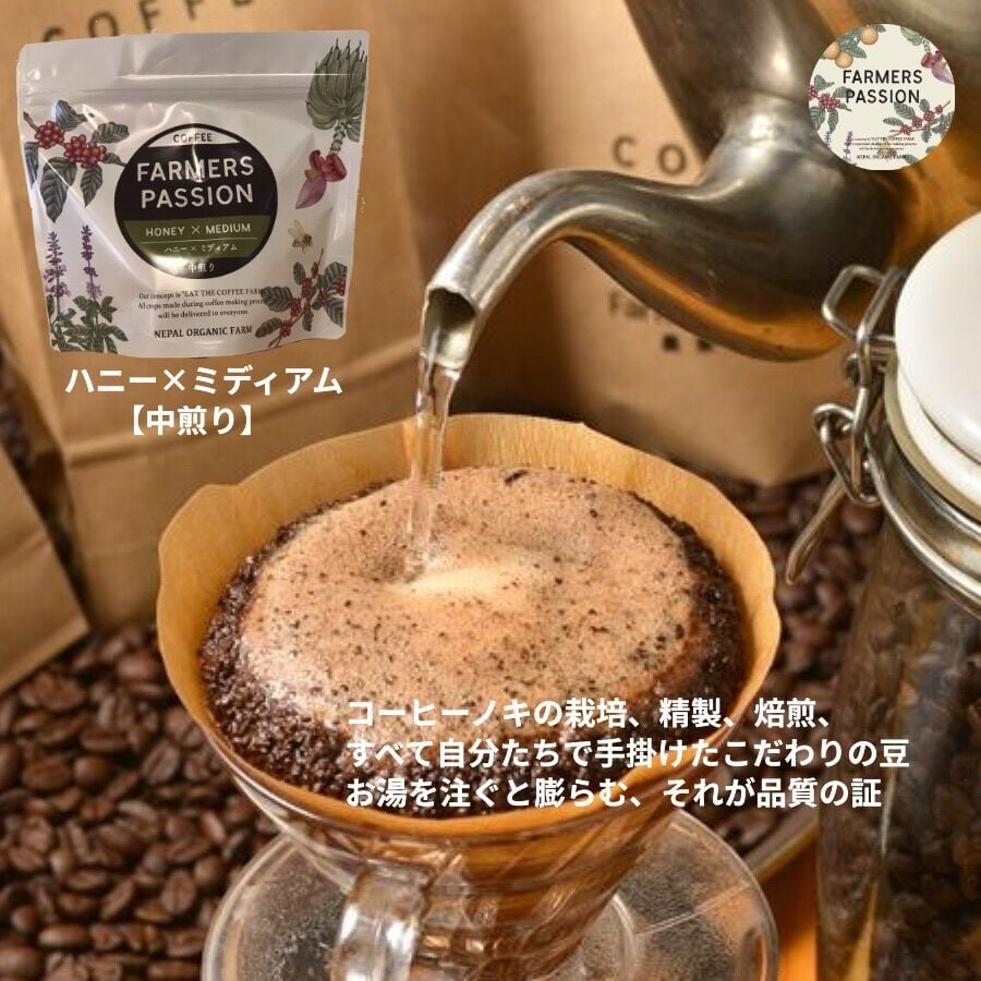 ■オーガニック & フェアトレード ネパールからの自家焙煎コーヒー FARMERS PASSION(ファーマーズパッション) 当店のコーヒーは、ネパール・シャンジャ地方の直営農園で、無農薬栽培で化学肥料を一切使わずに育てた 完全オーガニック/有機栽培のコーヒー豆を使用。自然本来の力を重んじた森林農法(アグロフォレストリー)によって、コーヒーの木だけでなくバナナやスパイスなど多様な植物と共存させることで、豊かな土地と生態系を守りながら丁寧に育てられています。 さらに、栽培から精製、焙煎、抽出に至るまで、すべてを自分たちの手で一貫管理。これにより、豆本来の風味を最大限に引き出すことに成功しています。