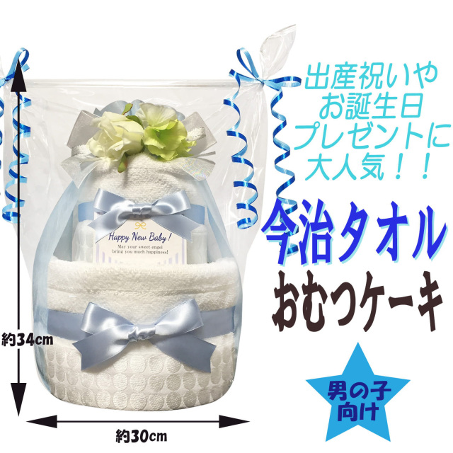 贈り物に大人気!今治タオルのおむつケーキは、安心安全の国産ブランド今治タオルのフェイスタオル、ウォッシュタオルをセットに、1つ1つ丁寧に手作りされたボリューム満点で豪華な男の子用の2段おむつケーキのギフトです♪土台に使用されているおむつは産婦人科使用率No.1のパンパースを衛生面に気を付けて1枚1枚袋入りになったおむつケーキになっております。全てのおむつケーキはギフト用にラッピングを施し、可愛いギフトボックスにお入れしてお送りいたします。おむつケーキは出産祝いはもちろん、内祝い、100日祝い、ハーフバースデー、初節句、お誕生日プレゼントにも大変喜ばれる贈り物です。