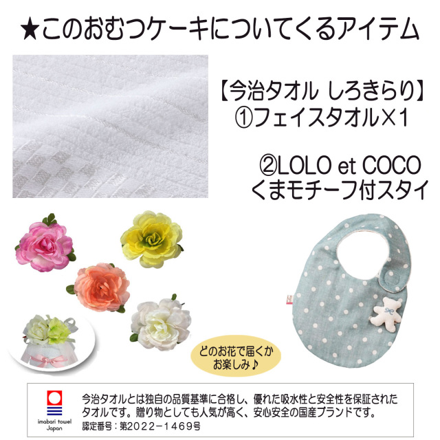 ●今治タオル しろきらり フェイスタオル×1 ●LOLOetCOCO クマモチーフ付スタイ×1 ●パンパース テープSサイズ 22枚 or Mサイズ 19枚 ●デザインギフトボックス ●メッセージカード ●ギフトラッピング |