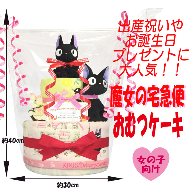 ■魔女の宅急便 ジジのおむつケーキ 女の子■ 赤ちゃんに大人気のジジのぬいぐるみとフェイスタオル、ウォッシュタオル、ガラガラなどをセットに、1つ1つ丁寧に手作りされた豪華な2段のおむつケーキのギフトです♪土台に使用されているおむつは産婦人科使用率No.1のパンパースを衛生面に気を付けて1枚1枚袋入りになったおむつケーキになっております。全てのおむつケーキはギフト用にラッピングを施し、可愛いギフトボックスにお入れしてお送りいたします。おむつケーキは出産祝いはもちろん、内祝い、100日祝い、ハーフバースデー、初節句、お誕生日プレゼントにも大変喜ばれる贈り物です。 |