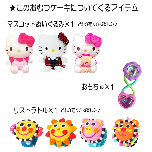 ●キティちゃんのマスコットぬいぐるみ×1 ●キティちゃん ウォッシュタオル×1 ●キティちゃん フェイスタオル×1 ●キティちゃん ベビーソックス×1 ●キティちゃん スタイ×1 ●おもちゃ×1 ●パンパース テープSサイズ 40枚 or Mサイズ 33枚 ●デザインギフトボックス ●メッセージカード ●ギフトラッピング |
