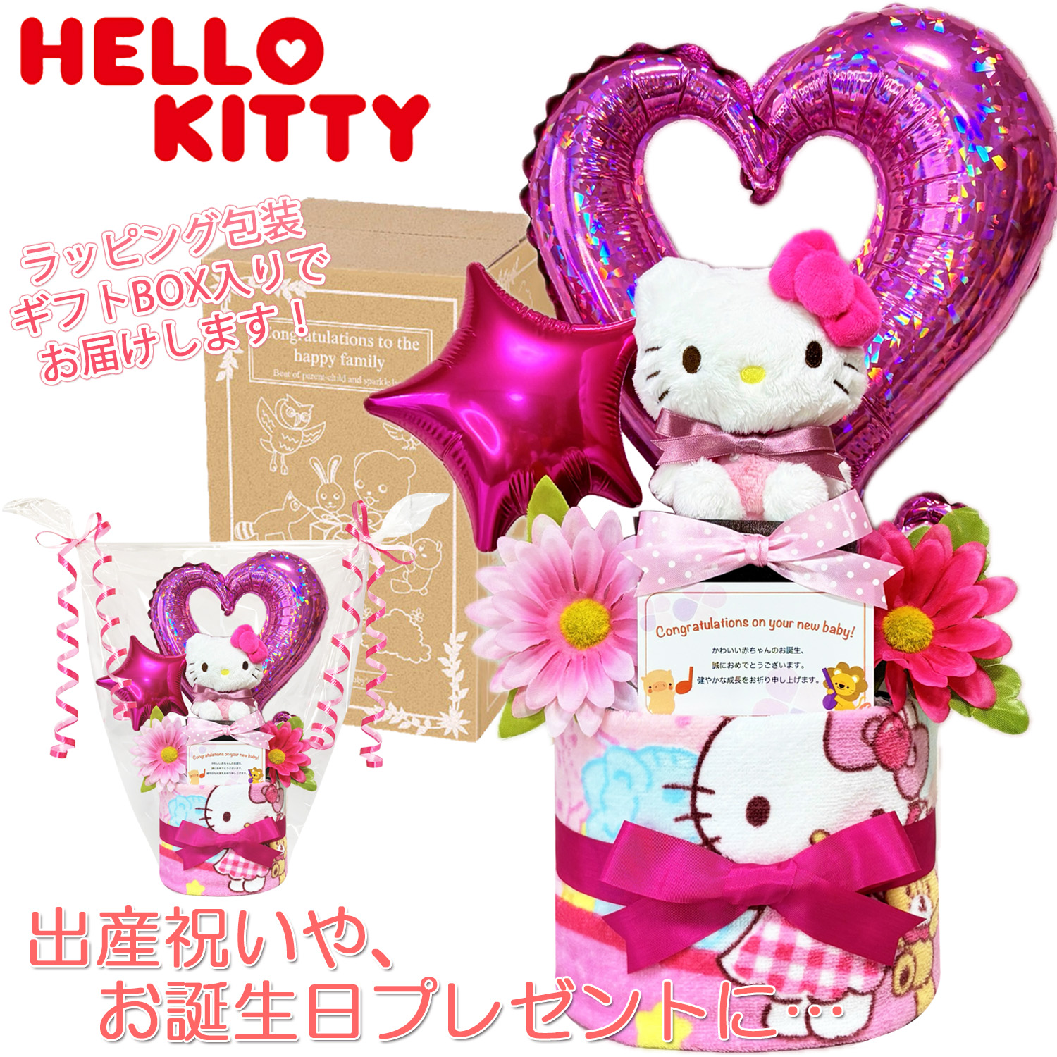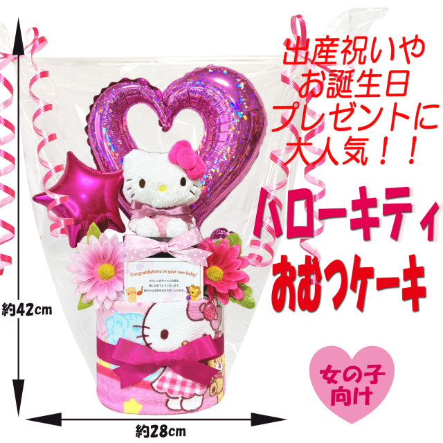 ■ハローキティのおむつケーキ■ 子供達に大人気のキティちゃんのぬいぐるみとウォッシュタオルをバルーンと組み合わせて、丁寧に1つ1つ手作りされたおむつケーキのギフトです♪大人気のキティちゃんとパンパースの組み合わせで豪華なおむつケーキになっております。出産祝いやお誕生日プレゼントに大変喜ばれるギフトです。ギフト用にラッピングを施し、可愛いギフトボックスにお入れしてお送りいたします。 |