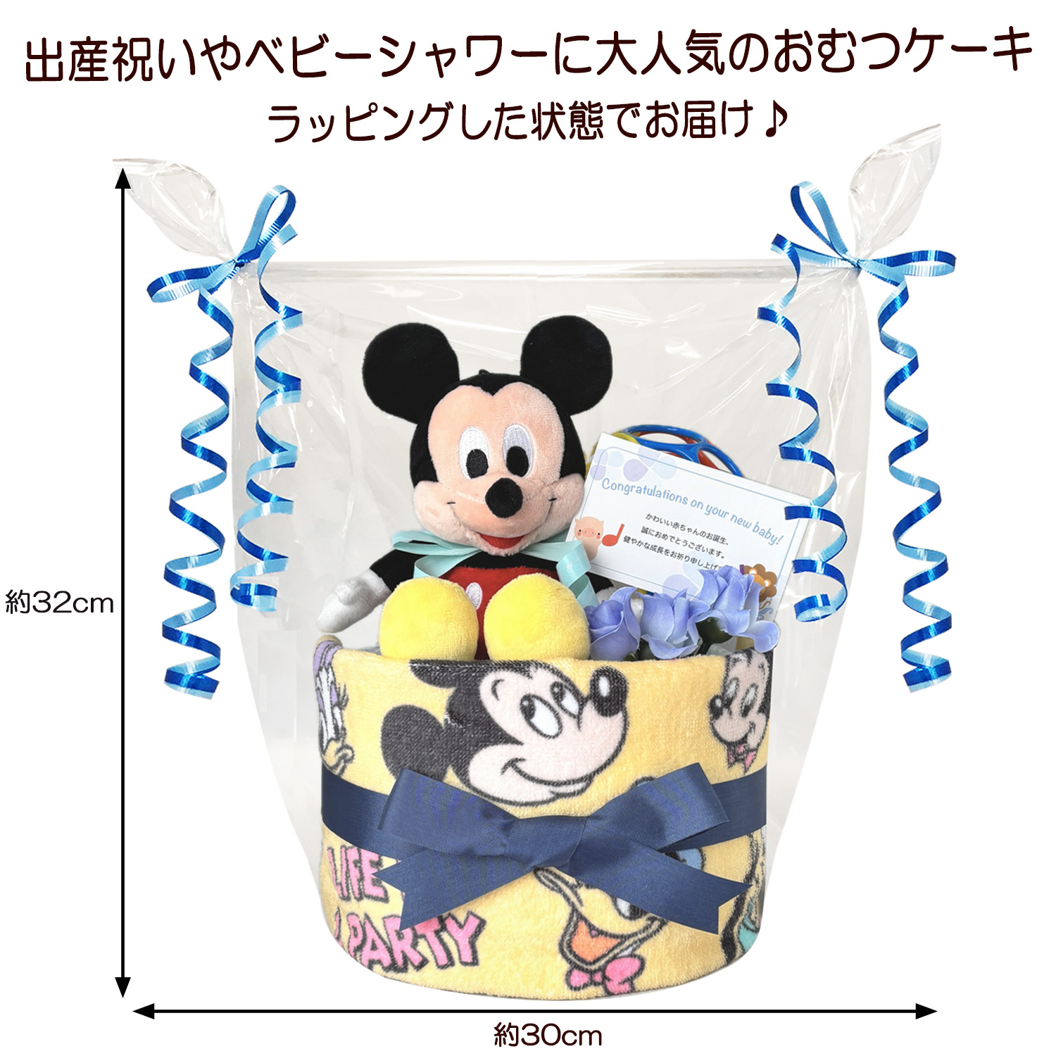 出産祝いに大人気のギフト、ディズニー ミッキーマウスのおむつケーキは、ぬいぐるみやウォッシュタオルをセットに1つ1つ手作りで制作されたおむつケーキのギフトです。ミッキーマウスとパンパースの組み合わせのおむつケーキになっております。さらに、出産祝いや内祝い、お誕生日プレゼント用にラッピングしてお贈りいたします。