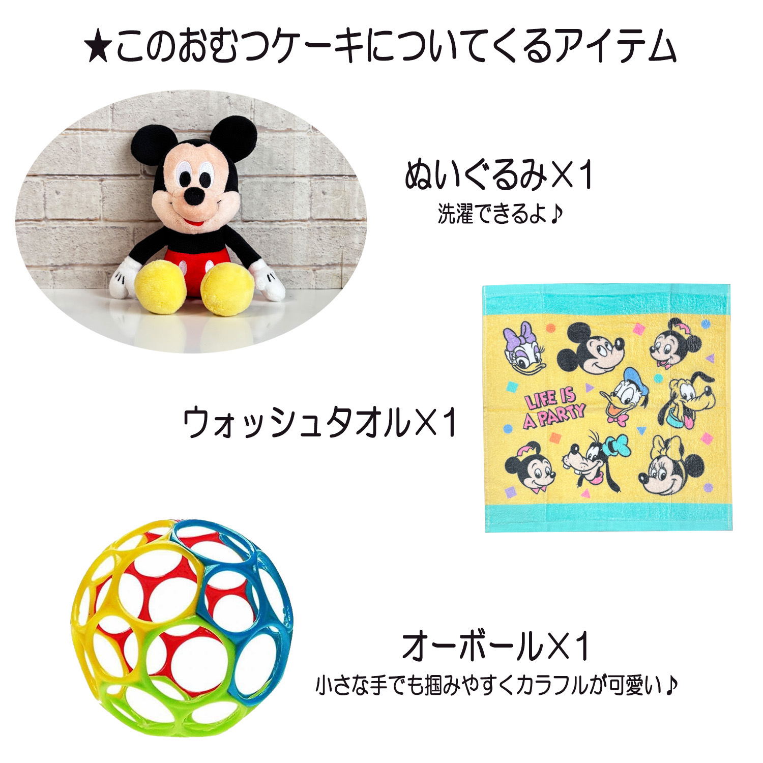 ●ミッキーマウスのぬいぐるみ×1 ●ミッキーマウス ウォッシュタオル×1 ●パパジーノ ベビー オーボール×1 ●パンパース テープSサイズ 20枚 or Mサイズ18枚 ●デザインギフトボックス ●メッセージカード ●ギフトラッピング |