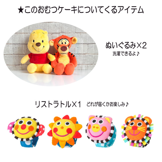 ●くまのプーさんのぬいぐるみ×1 ●ティガーのぬいぐるみ×1 ●くまのプーさん ウォッシュタオル×2 ●くまのプーさん フェイスタオル×1 ●Sassy/サッシー リストラトル×1 ●バルーン小×2 ●バルーン大×1 ●パンパース テープSサイズ 40枚 or Mサイズ33枚 ●デザインギフトボックス ●メッセージカード ●ギフトラッピング |