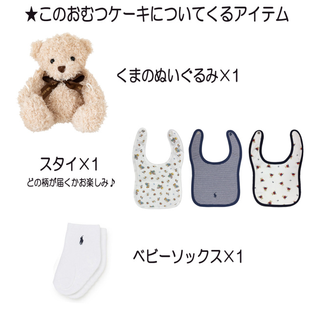 ●ラルフローレン フェイスタオル×1 ●ラルフローレン ウォッシュタオル×1 ●ラルフローレン ベビーソックス×1 ●ラルフローレン スタイ×1 ●くまのぬいぐるみ×1 ●バルーン×2 ●パンパース テープSサイズ 40枚 or Mサイズ 33枚 ●デザインギフトボックス ●メッセージカード ●ギフトラッピング |