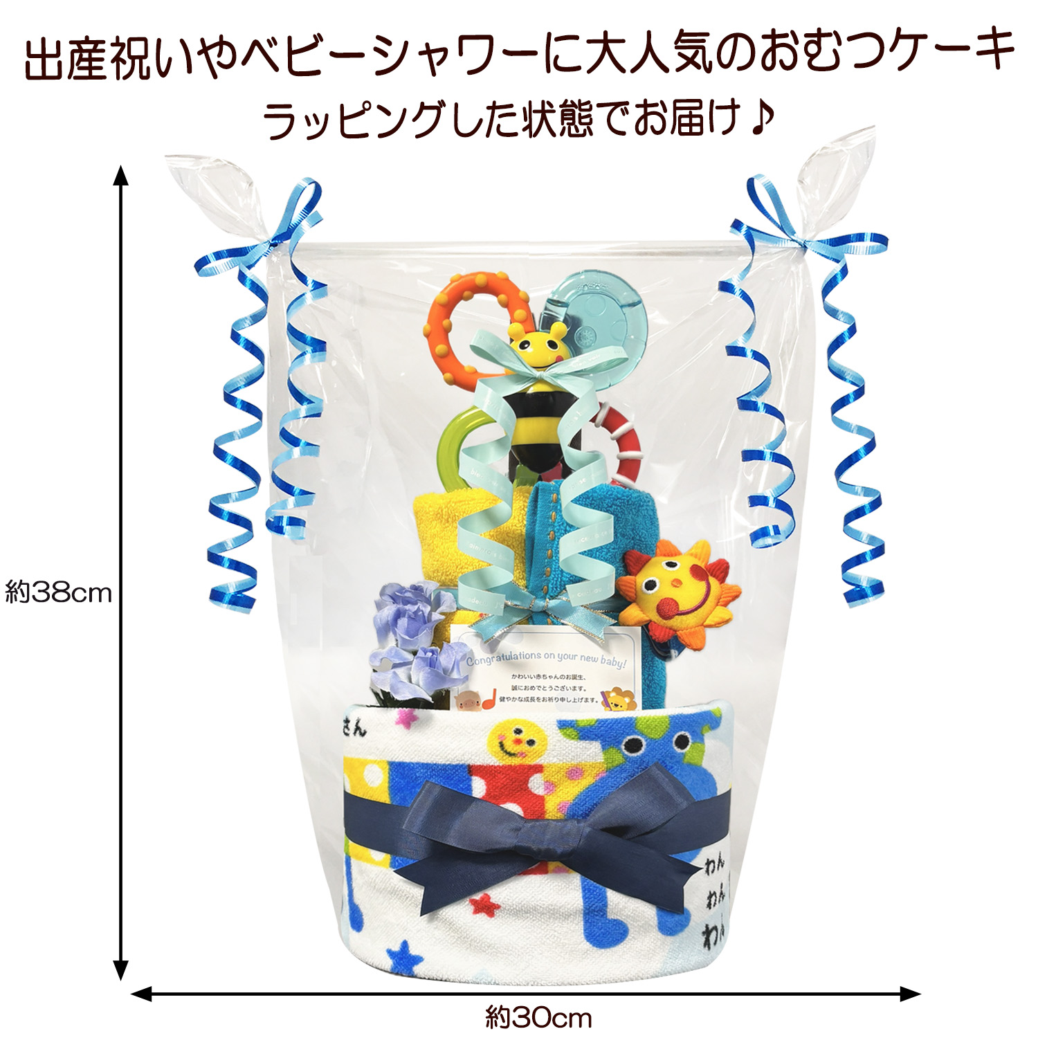 | ギフトラッピングについて | ●当店のおむつケーキは無料でプレゼント用のかわいいギフトラッピング済みです。 |