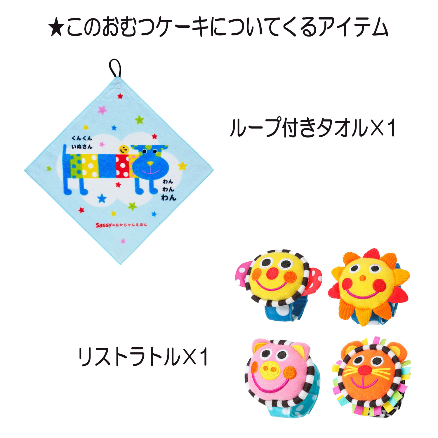 | 製品名: | 出産祝いに大人気のSassy/サッシーのおむつケーキ/ループ付きタオル/赤ちゃんの内祝い・誕生日プレゼントやギフトセットsas3024 |