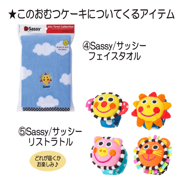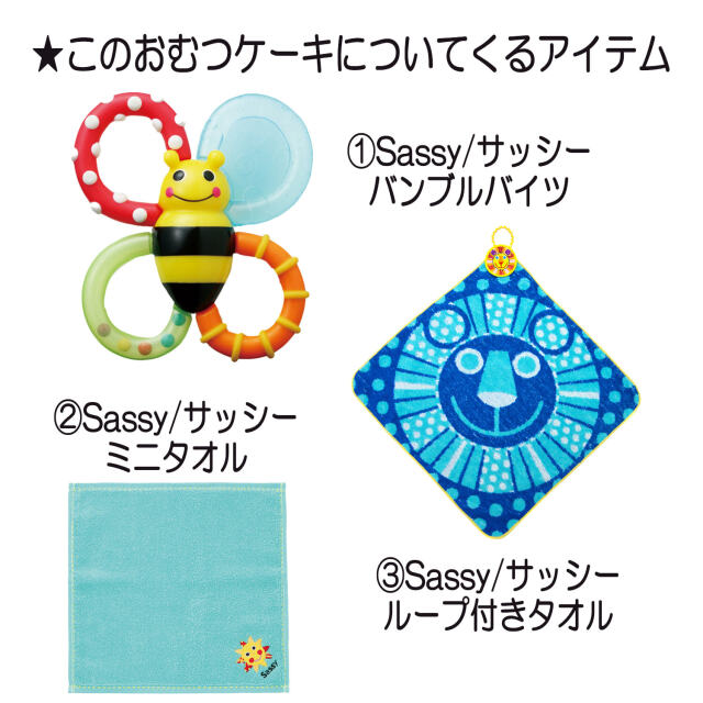 ●Sassy/サッシー バンブルバイツ×1 ●Sassy/サッシーのミニタオル×1 ●Sassy/サッシーのループタオル×1 ●Sassy/サッシーのフェイスタオル×1 ●Sassy/サッシー リストラトル×1(※種類はお選びいただけません) ●パンパース テープSサイズ 22枚 or Mサイズ 19枚 ●デザインギフトボックス ●メッセージカード ●ギフトラッピング |