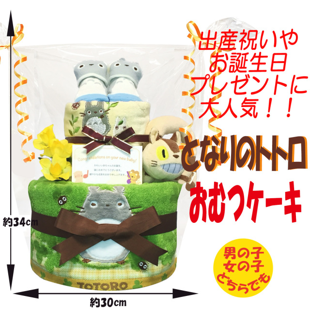 出産祝いのお祝いで大人気のギフトのとなりのトトロのおむつケーキは、靴下やガラガラ、ウォッシュ・フェイスタオルをセットに1つ1つ手作りで制作された2段おむつケーキのプレゼントギフトです。となりのトトロとパンパースの組み合わせのおむつケーキになっております。おむつケーキには、ギフトラッピング・メッセージカードがセットになり、ギフトボックスに入っております。
