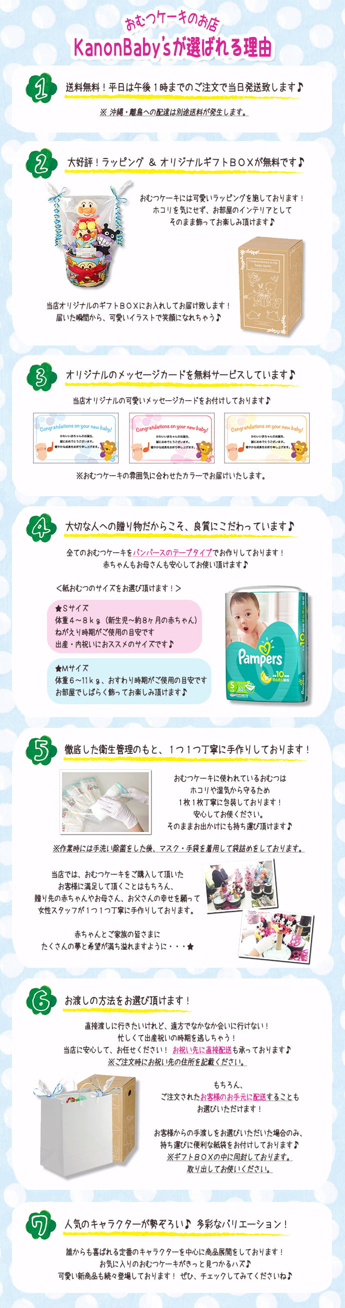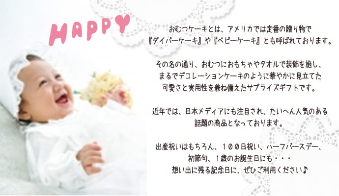 赤ちゃんの出産祝いや一歳のお誕生日プレゼントに話題のおむつケーキ販売ショップ『Kanon Babys』にようこそ!人気のSassy/サッシーやアンパンマン、となりのトトロ、ディズニーのミッキー、ミニーちゃん、プーさん、ダッフィー、シェリーメイ、ステラルー、ラルフローレン、キティちゃん、ミニオンズ、はらぺこあおむし、スヌーピーなど可愛いおむつケーキを取り扱いしております。各キュアラクターのおもちゃやタオルを使い、1点1点手作りで制作されたおむつケーキです。KanonBabysのおむつケーキは、男の子にも女の子にもどちらにも喜ばれる作りをしております。おむつケーキは赤ちゃんの出産祝いはもちろん、ハーフバースデー、1歳のお誕生日、ベビーシャワー、初節句、100日祝いなど、様々な場面で活躍する大人気のお祝いギフトです。すべてのおむつケーキに、ギフト用のラッピングとメッセージカード、ギフトBOXに入れてお送りいたしますので、大変豪華なプレゼントとなっております。プレゼント先への直送も対応しております。赤ちゃんの出産祝い・お誕生日プレゼントの贈り物にお悩みの方は、おむつケーキを贈ってみてはどうですか?おむつケーキの事なら、名古屋市のすぐお隣の長久手市にある、おむつケーキ専門ショップ「KanonBaby's」にお任せください。