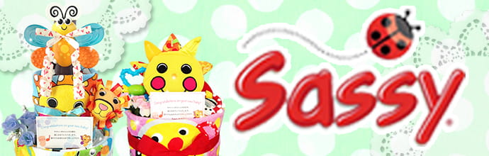 赤ちゃんの出産祝いにSassy/サッシーのおむつケーキを贈りませんか?Sassy/サッシーのおむつケーキは、おもちゃやタオルを使って、1つ1つ丁寧に手作りで制作されたおむつケーキのプレゼントギフトです♪Sassy/サッシーの特徴は、虫や動物をモチーフにしたユニークなキャラクターと派手なカラーデザイン!sassyの商品開発にはデザインには児童心理学者やアーティスト、デザイナー、技術者により児童心理学を取り入れたデザインになっており、日々成長する赤ちゃんの五感を刺激してくれる商品となっております。
